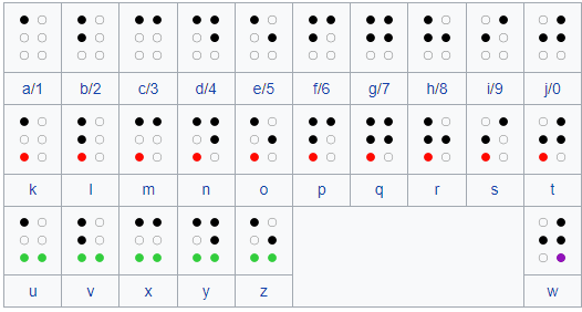 Braille is a reading and writing system for visually impaired people. It’s composed of 6 dots (“Braille cell”) that’s ordered top-down, left-right using bumps and dots as such.