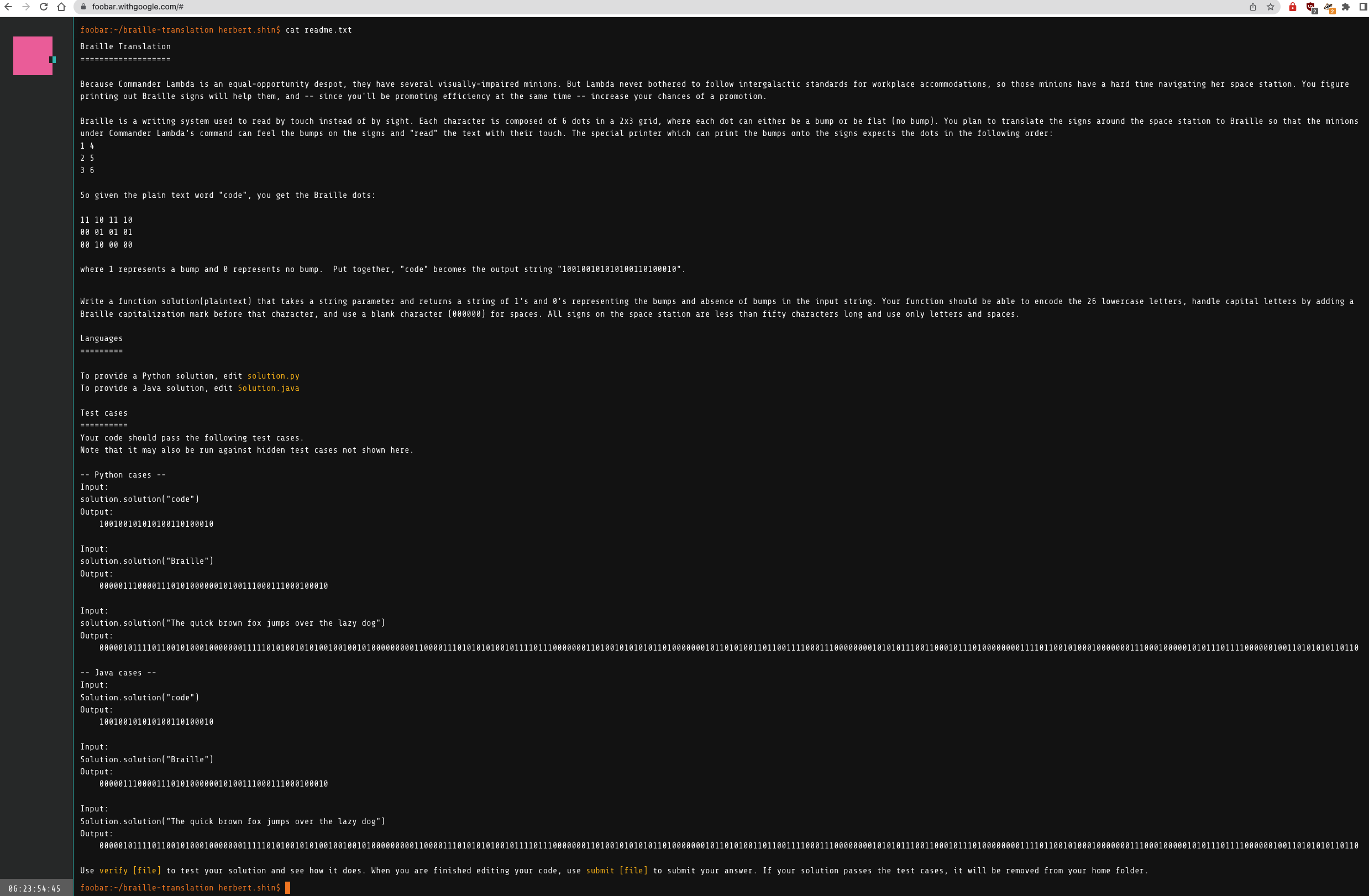 After trying to read my apartment’s Braille fire escape instructions just using my fingers, I think that’s because it’s difficult to differentiate the above with zero visual guidance. Nonetheless, I decided to hack together a crude replication of the Braille table from Wikipedia and add the problem’s additional capitalization and space constraints.